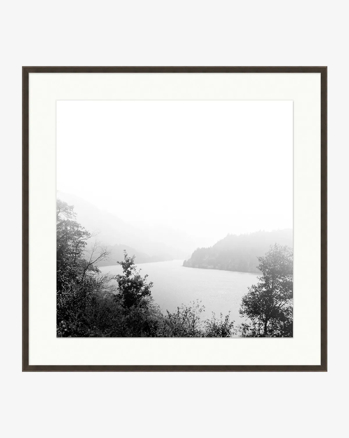 Capturing the mysterious feel of a foggy lake, Mist on the Lake brings the powerful simplicity of black and white photography to your space. Finished in a black woodgrain frame, this giclee print on paper is straight cut and floated on a mat with gallery-quality materials.