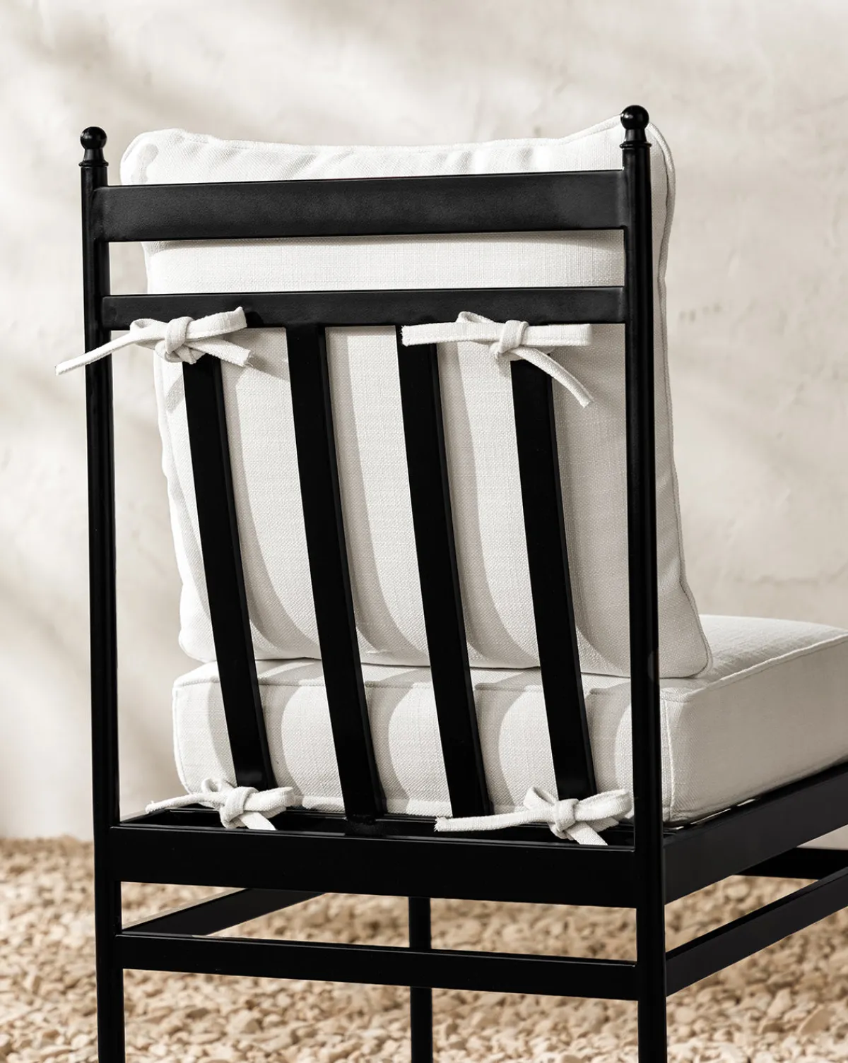 Exuding a sense of refined luxury, we designed our Pomeroy Outdoor Dining Chair with style and resilient materiality in mind. The intricately detailed powder-coated steel frame is crafted with a decorative yet sturdy leg base and ball finials on the back. Upholstered in our Pasadena White indoor/outdoor performance fabric, it features knife edge cushions, a double button tufted back, and a box cushion seat with piping details. Offering timeless style, comfort, and durability, it brings an enduring elegance to your indoor or outdoor dining experience.
