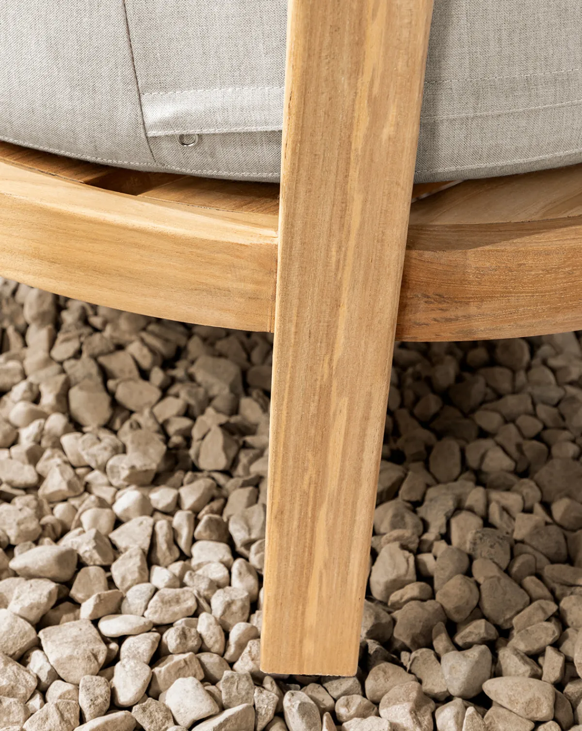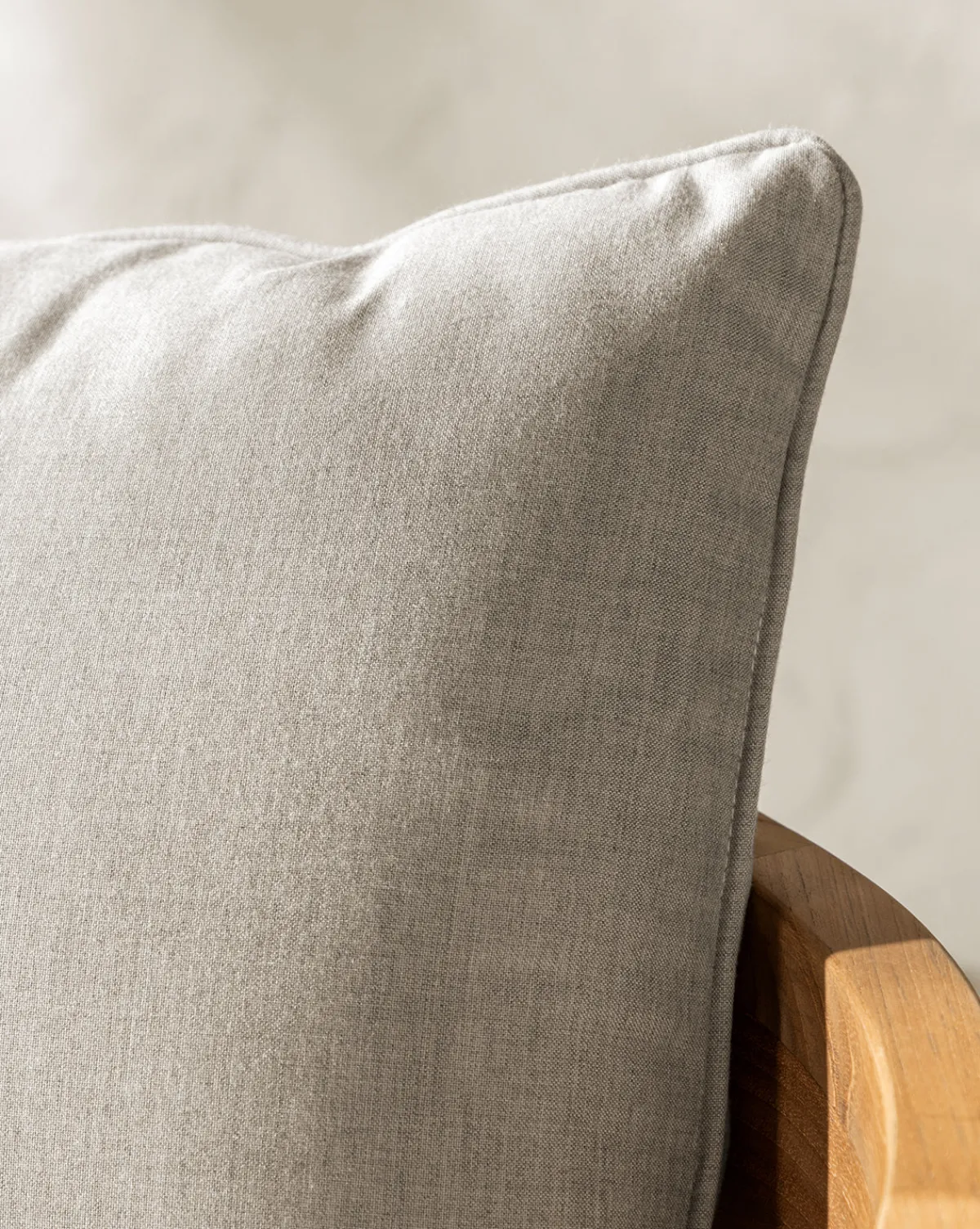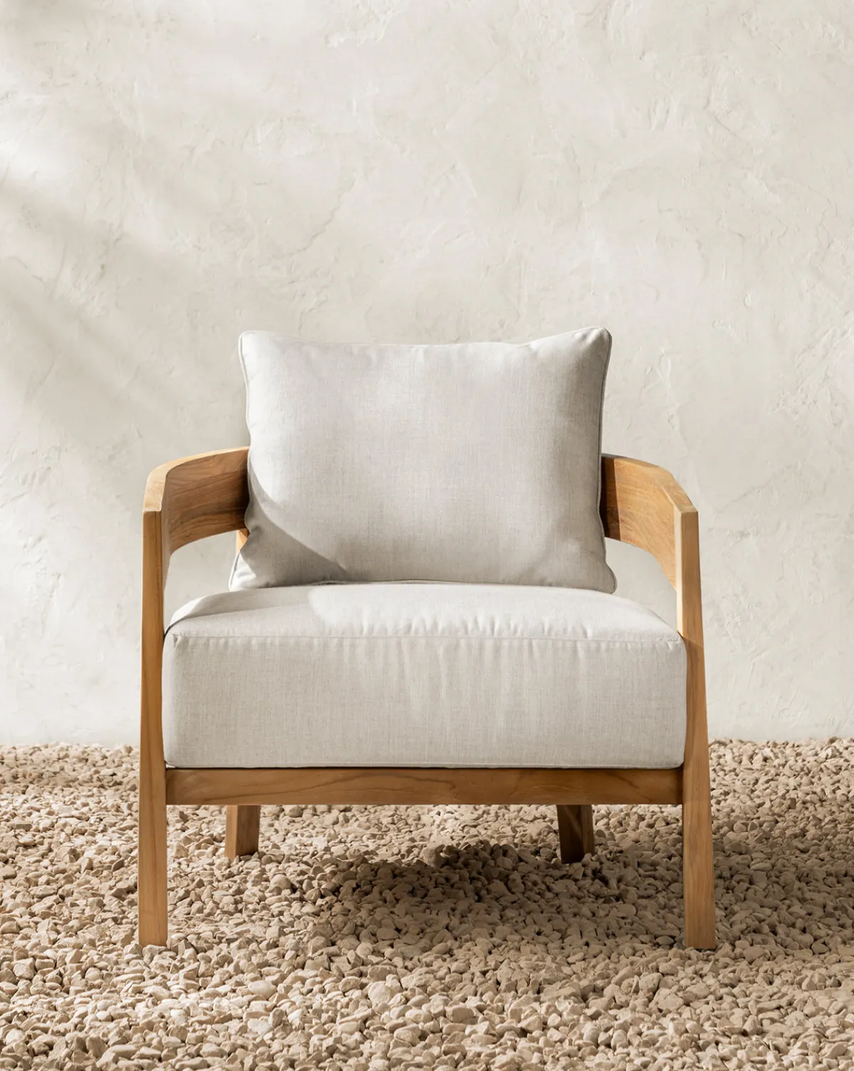 Bringing indoor elements to outdoor furniture, the Vento Teak Outdoor Chair gives balance to lounging. In a smooth, curved frame of high-quality teak wood, its curvature creates a beautiful shape in outdoor lounge spaces. Its cushions are thick and soft, with a moveable back pillow all upholstered in cast-silver Sunbrella fabric. Every element of this piece is all-weather, making it easy to incorporate the piece into barefoot basking without worrying about its durability in the sun.